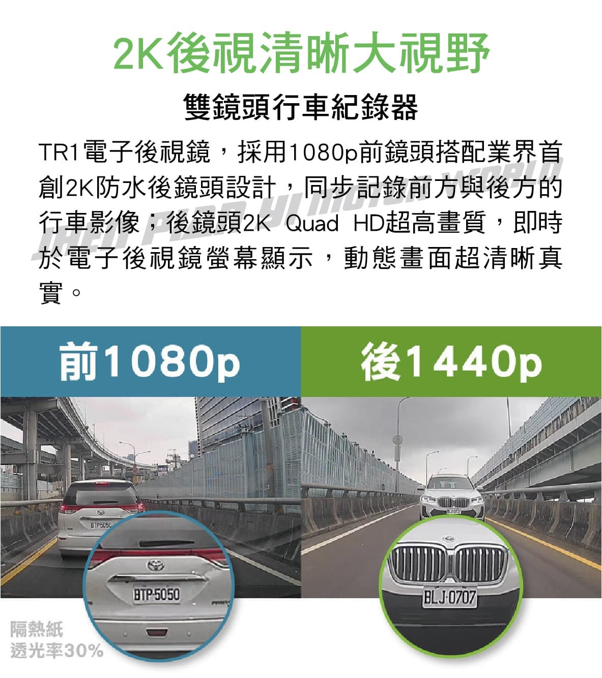 ◆ 後鏡頭2K Quad HD超高畫質,即時於電子後視鏡螢幕顯示